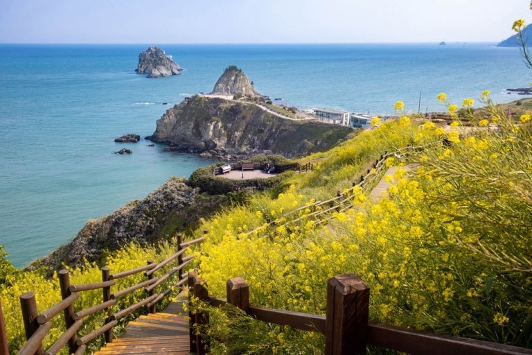 2. 이기대해안산책로 – 이기대해안산책로는 부산 남구 용호동 해안 절벽을 따라 조성된 트레킹 코스로 동생말~어울마당~농바위~오륙도 해맞이공원을 잇는 해파랑길과 갈매길의 일부, 약 4.7km 구간입니다. 데크와 구름다리, 바윗길·숲길이 어우러져 바다와 숲의 정취를 함께 즐길 수 있으며 종착지점인 오륙도 해맞이공원에는 유채꽃이 한창인 시기입니다.